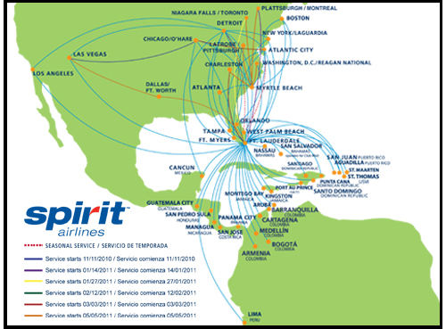 Spirit is an ultra-low-cost (read no frills) airlines which I’ve flown. They serve a limited number of destinations, including many in and around the Caribbean (see image above).