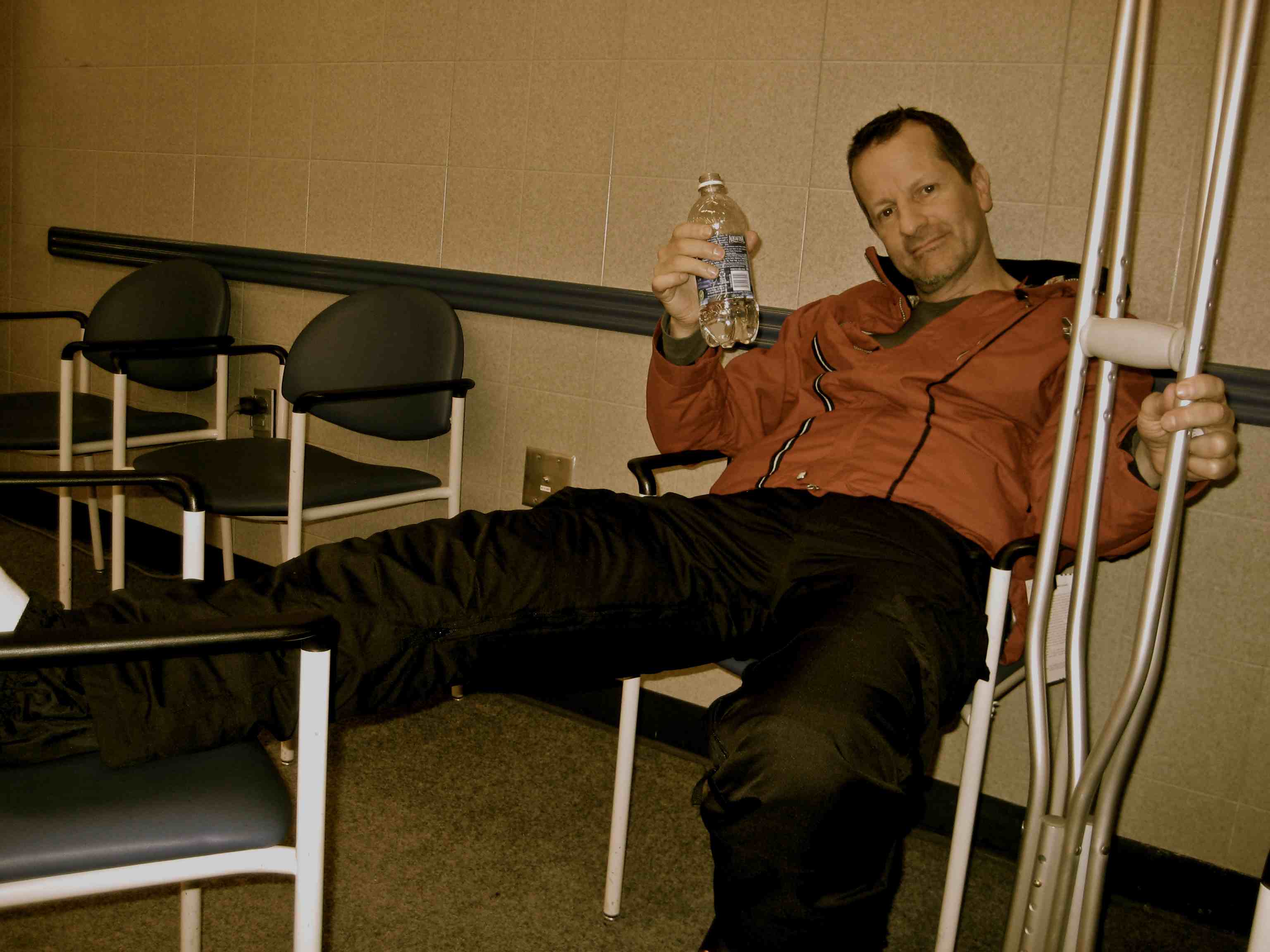 After a ski accident, Ed waits for doctor to check his knee. Turns out he tore two ligaments.